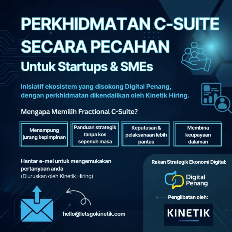 Digital Penang, dengan kerjasama Kinetik Hiring, memperkenalkan pendekatan yang praktikal dan boleh diskalakan untuk membantu startup dan PKS di Pulau Pinang mendapatkan akses kepada bakat C-suite berpengalaman — menyokong syarikat untuk berkembang, meningkatkan skala, dan menangani cabaran perniagaan yang kritikal.