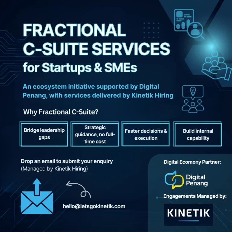Digital Penang, in collaboration with Kinetik Hiring, is bringing a practical and scalable way for Penang startups and SMEs to tap into experienced C-suite talent — helping companies grow, scale, and navigate critical business challenges.